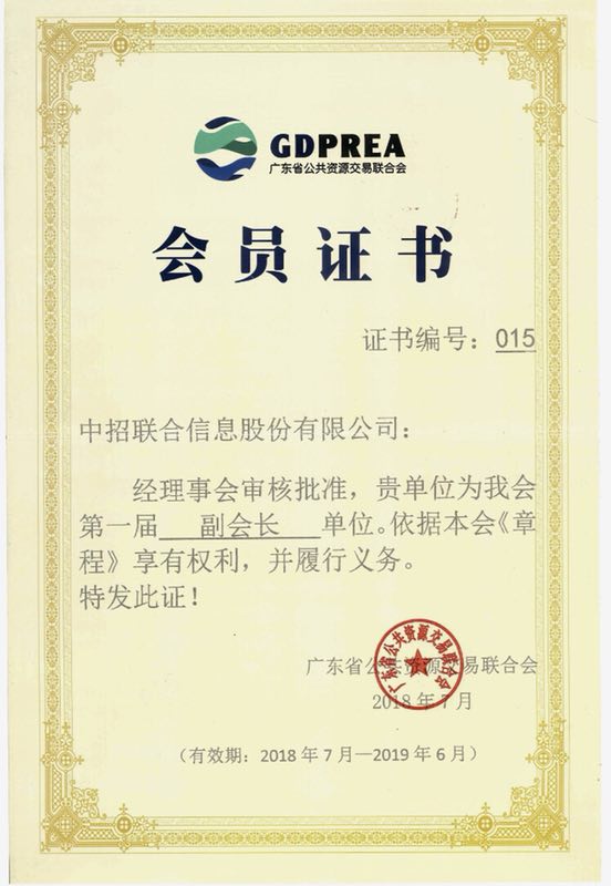 2018年7月27日,经广东省公共资源交易联合会理事会议案决定,中招联合信息股份有限公司正式加入广东省公共资源交易联合会,并成为第一届副会长单位。