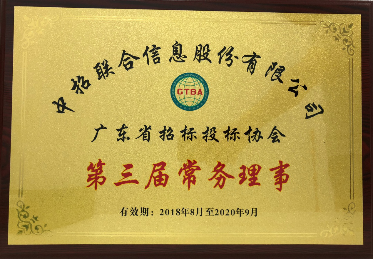 2018年7月30日,经广东省招标投标协会第三届理事会讨论通过,中招联合信息股份有限公司为广东省招标投标协会常务理事单位。