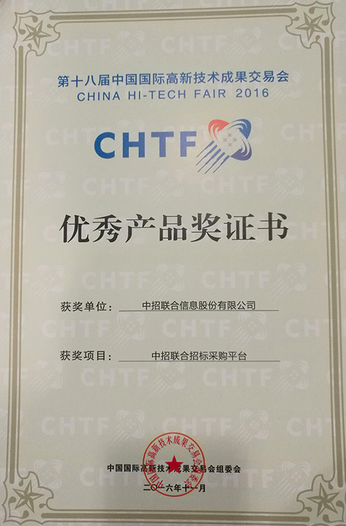 2016年11月16日,以“创新驱动 质量引领”为主题的第十八届中国国际高新技术成果交易会在深圳会展中心隆重开幕,闭幕式上,中招联合招标采购平台荣获优秀产品奖,成为唯一一个获此殊荣的第三方电子招标交易平台。中国机电设备招标中心主任、党委副书记白会宜、副主任王健翔以及中招联合信息股份有限公司董事长刘善明、中招国际招标有限公司原董事长郎朗出席高交会。